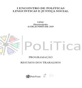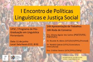 Promovido pelo Programa de Pós-graduação em Linguística da Universidade Federal de Santa Catarina (PPGL/UFSC) e pelo grupo de Políticas Linguísticas Críticas, o I Encontro de Políticas Linguísticas e Justiça Social será realizado na tarde do dia 11 de junho de 2019, na Sala Hassis, no térreo do bloco B do Centro de Comunicação e Expressão (CCE). Com inscrições gratuitas e realizadas no local, o Encontro tem a seguinte programação:
